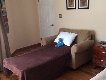 (King bed, oversized chair that converts to a twin bed to accommodate a